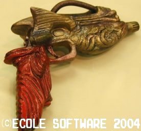 | ←回覧された、FRP製の「クリムゾン」 造型師のかたが作られたそうで、PS2用ガンコン2がベースになっています。 以前俺はバーチャガンの中に、ドリームキャストガンの基盤を突っ込む 改造をしたことがありますが、スイッチ類はちゃんと動いたけれども、 照準が使い物になりませんでした。 |